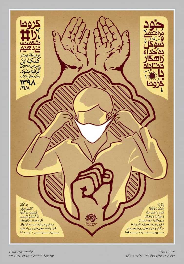 این اثر از سوی محمدمهدی ولیزاده؛ مدرس کارگاه طراحی پوستر و از هنرمندان و طراحان گرافیک استان با بهرهگیری از تکنیک حروفنگاری و تلفیقی از المانهای دعا کردن و با الهام گرفتن از آیه ۲۸۶ سوره بقره (رَبَّنَا وَلَا تُحَمِّلْنَا مَا لَا طَاقَةَ لَنَا بِهِ وَاعْفُ عَنَّا وَاغْفِرْ لَنَا وَارْحَمْنَا؛ پروردگارا آنچه تاب آن نداریم، بر ما تحمیل مکن و از ما درگذر و ما را ببخش و بر ما رحمت آور) طراحی و در فضای مجازی منتشر شده است، این اثر هموطنان را بر توکل بر خدا و خود مراقبتی و رعایت نکات بهداشتی دعوت مینماید.