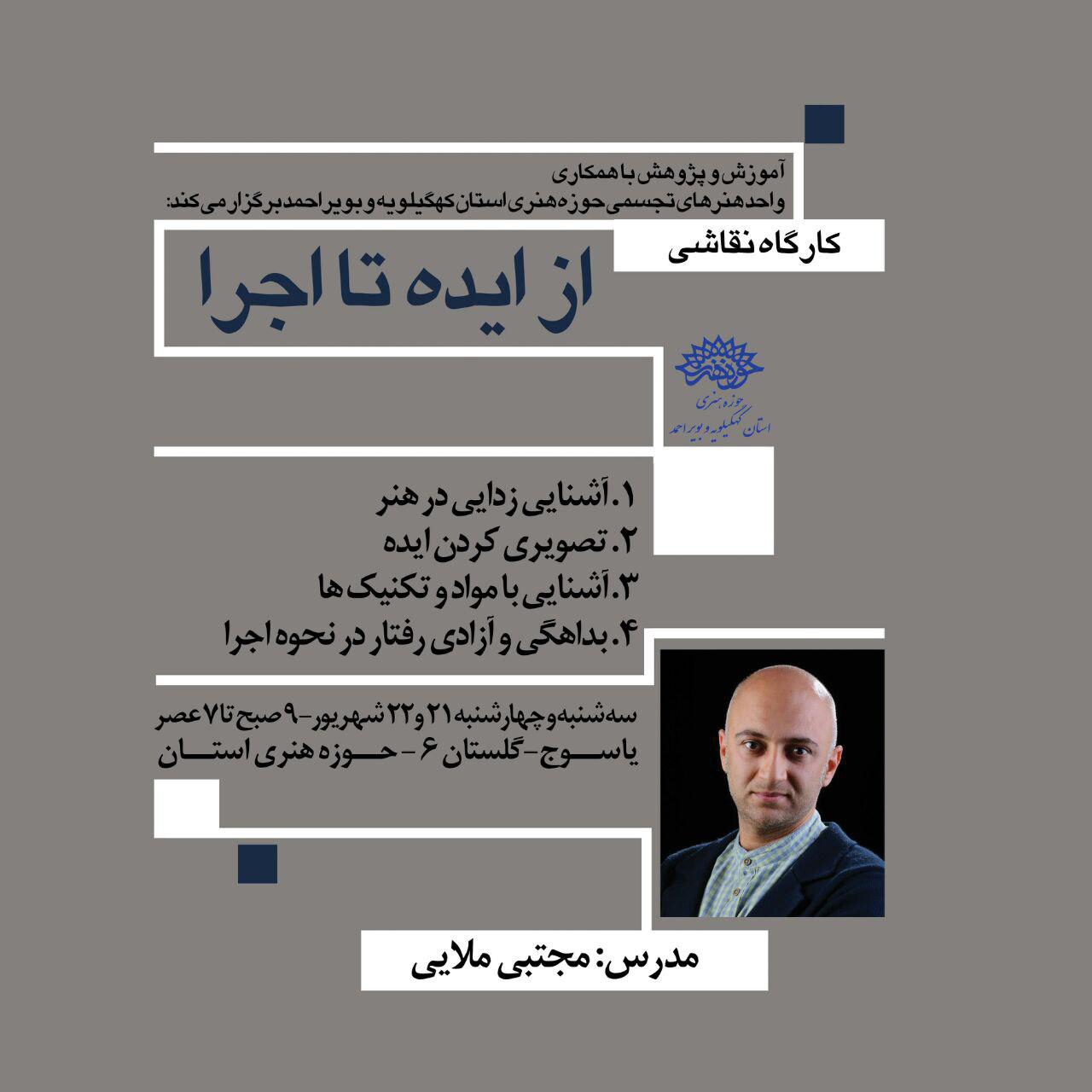لازم به ذکر است کارگاه در رزوهای 21 و 22 شهریور ماه از ساعت 9 تا 19 و با تدریس در یاسوج، گلستان 6، حوزه هنری برپا خواهدبود.