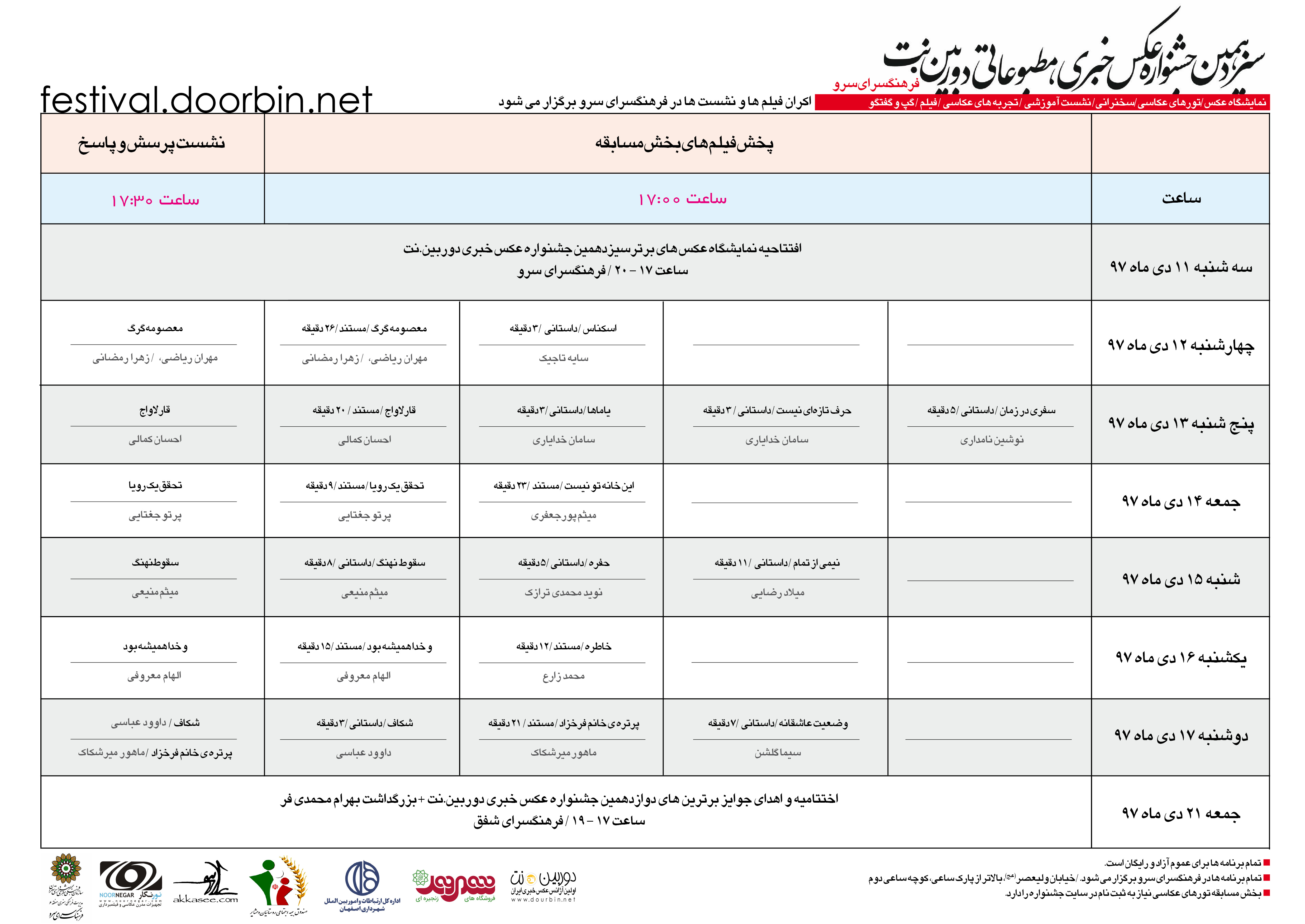 جمعه ۲۱ دی ۹۷، ساعت ۱۷ تا ۱۹، مراسم اختتامیه، اهدای جوایز بخش های مختلف عکس و فیلم و آیین بزرگداشت بهرام محمدیفر از عکاسان باسابقه خبری و دفاع مقدس حسن ختام جشنواره دوازدهم خواهد بود.