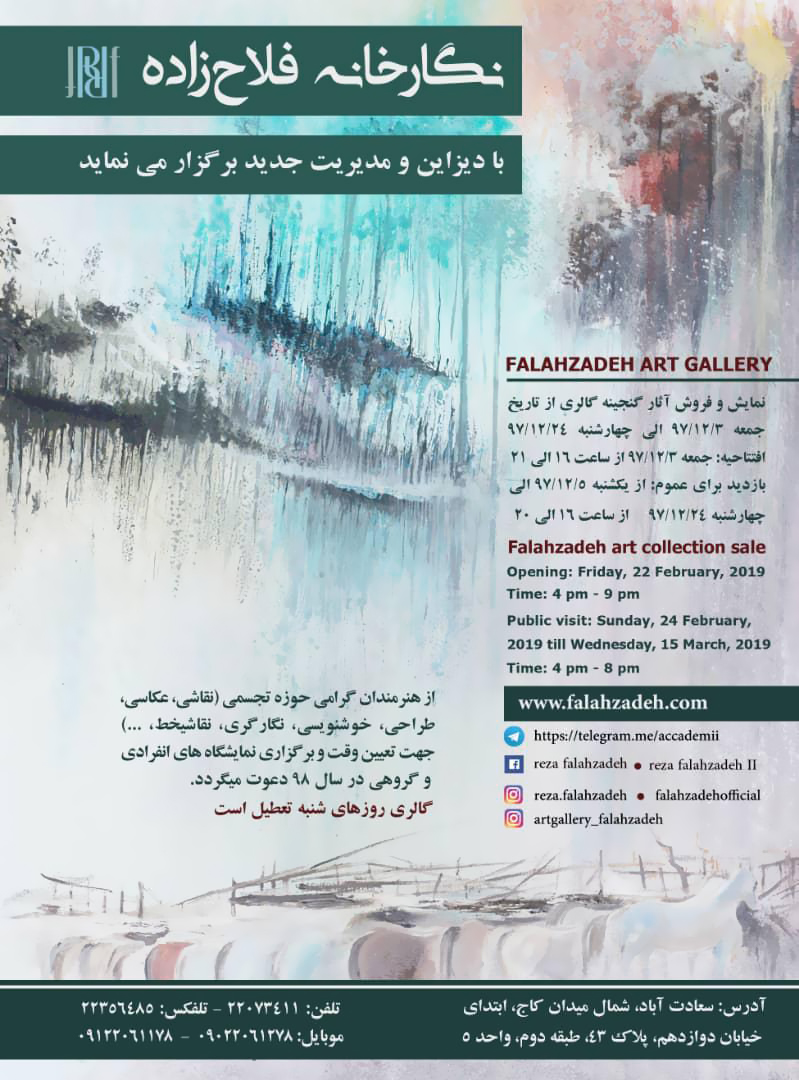 به گزارش روابط عمومی مرکز تجسمی حوزه هنری، نگارخانه فلاحزاده با دیزاین و مدیریتی جدید از روز جمعه سوم اسفندماه با نمایش آثار منتخب ۵ سال اخیر رضا فلاحزاده و گنجینه گالری افتتاح میشود.