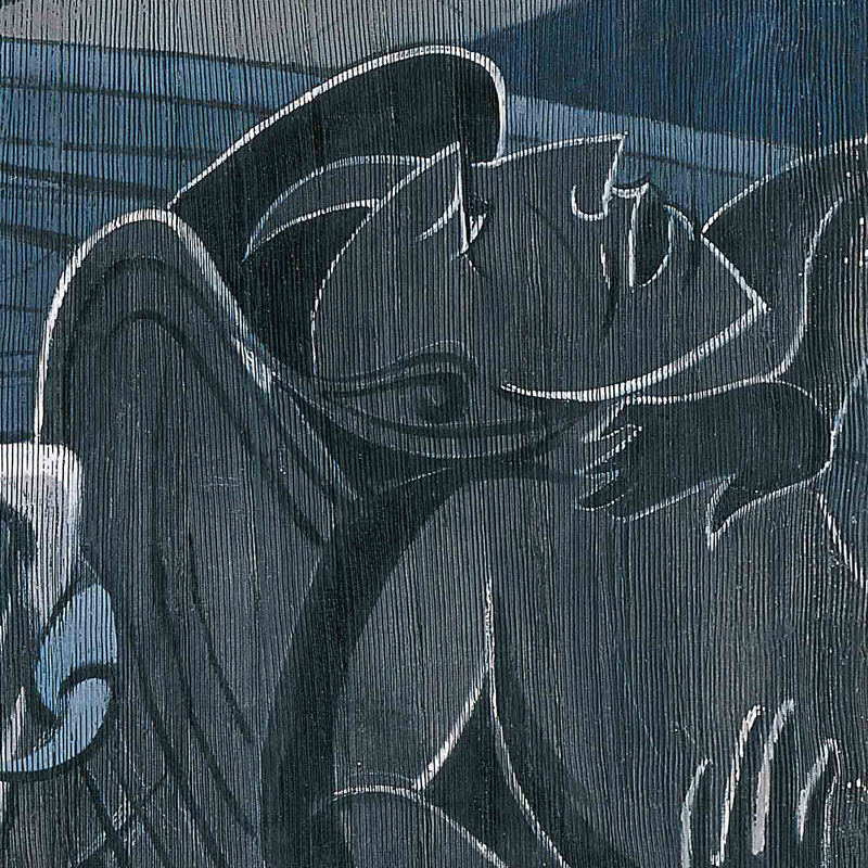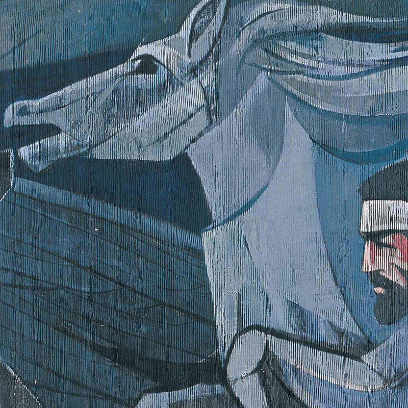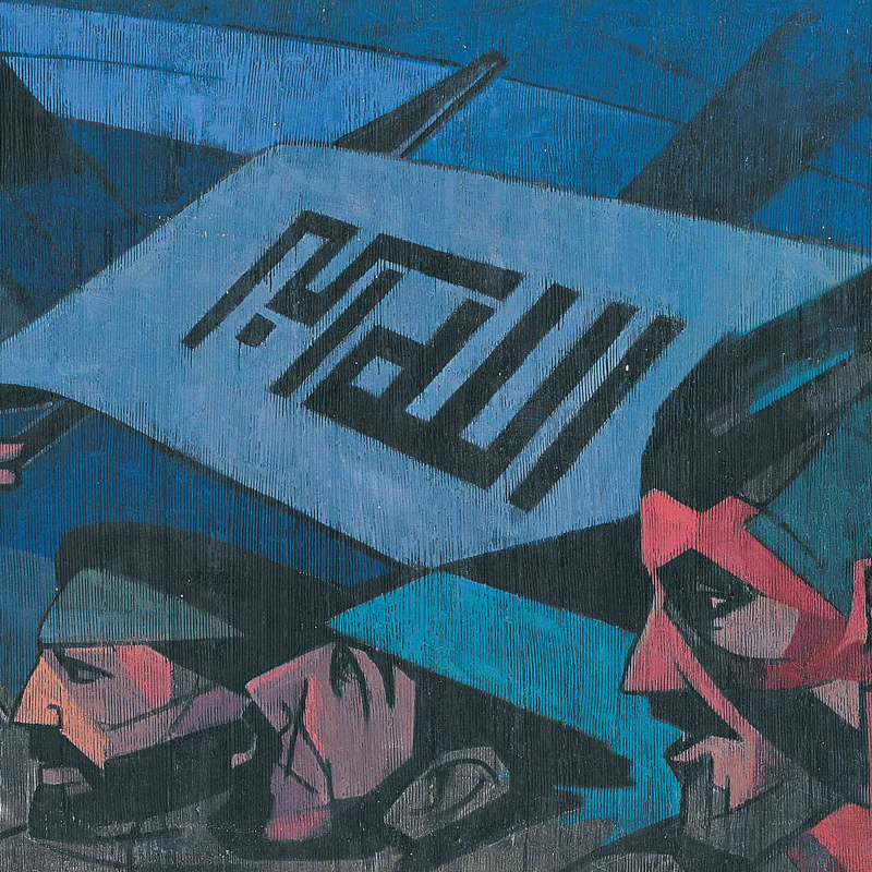 قابی بسیار کشیده که باید حتما برای دیدنش سرتان را بچرخانید. فیگوری با دست بسیار قوی پرچم یک انقلاب را در دست دارد و در سوی دیگر تابلو، فرشته ای با ظاهری انقلابی، دارد با بالهایی بزرگ پرچمی الهی را با خود حمل می کند. در مرکز تابلو پرنده ای که همان نماد استکبار است، به پرندگان منادی صلح حمله کرده است و نماد صلحی (شاخه زیتون) که از زمان حضرت نوح حامل آن است را بر دهان دارد، گویی اکنون زمان انقلاب است. نقاشی هنریست که همواره از گونه های خود تاثیر می پذیرد و نقاشی ایران در سالهای انقلاب اسلامی نیز از قاعده مستثنا نیست.