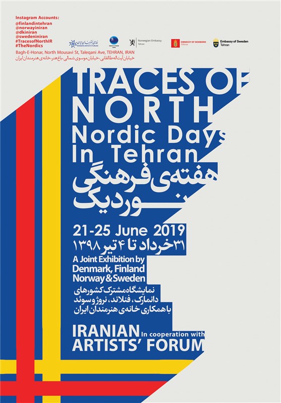 این نمایشگاه «رد پای شمال، روزهای شمالی در تهران» نام دارد.در بخش نمایشگاهی دانمارک، مبلمان طراحی شده توسط آرشیتکتهای معروف جهانی همچون آرنه یاکوبسن و پل هنینگسن به نمایش گذاشته میشود.در بخش نمایشگاهی فنلاند، نمایشگاه پوستر اریک بروون به نمایش گذاشته میشود. در این نمایشگاه ۵۰ اثر از اریک بروون به روی دیوار میروند.در بخش نمایشگاهی نروژ، مجموعه عکسهایی از «مسیرهای خوشمنظره» نروژ به نمایش در میآید. در این نمایشگاه ۵۷ اثر به نمایش گذاشته میشود.