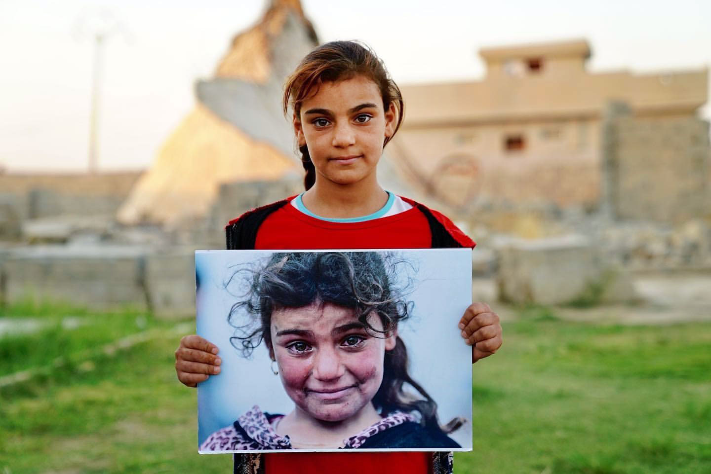 «علی فهداوی» که این عکس مشهور را در تاریخ ۱۶ مارس ۲۰۱۷ (۲۶ اسفند ۱۳۹۵) ثبت کرده، حالا پس از گذشت حدود دو سال، بار دیگر این دختربچه را یافته و از او عکاسی کرده است. این کودک عراقی «سبأ» نام دارد.